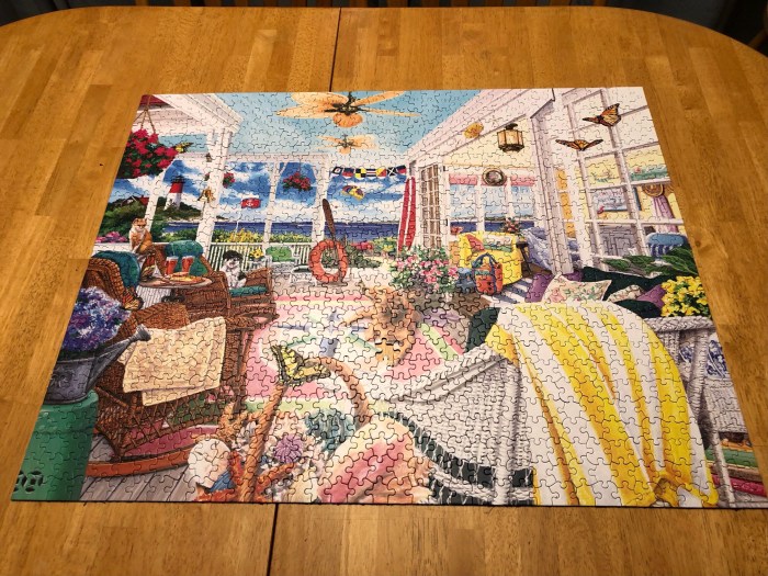 Together and individually, three 1,000-piece jigsaws were assembled and then put back in their boxes (after I crept in to capture the photo, of course). Long may they continue to enjoy these challenges as I sit nearby and read a novel and watch TV simultaneously.