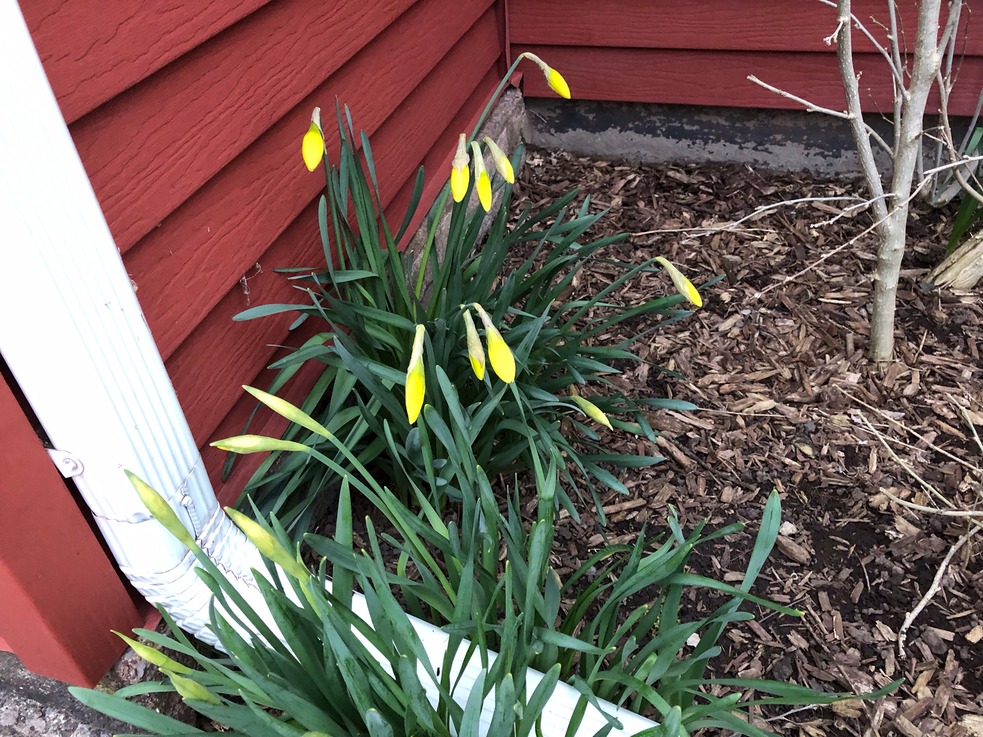 The up-and-down temperature game this spring caused a bit of breath-holding between the sprout of green and the appearance of the yellow flowers of our front-ard daffodils.