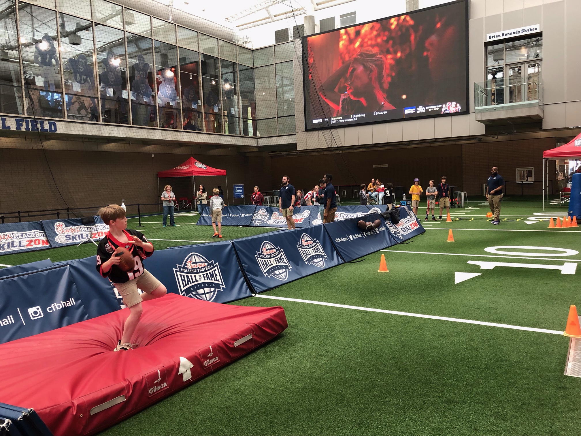 Upon exit, all are ushered into a field room where the youngsters are encouraged to show off football moves as staffers throw passes and such.