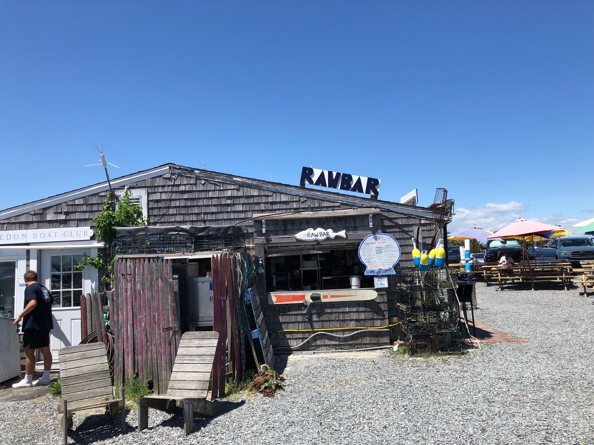 The true-blue marina joint carries waterfront atmosphere to the max.