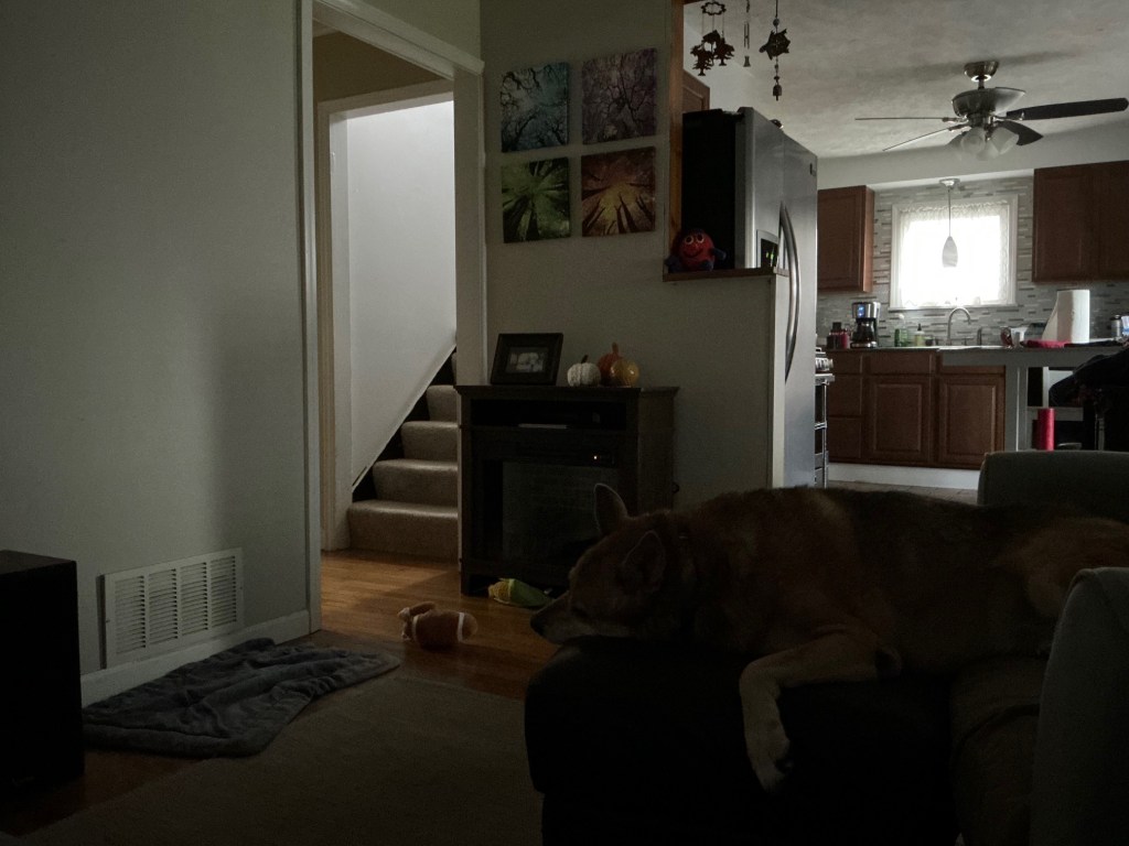Our cherished rescue mutt owns the living room as daylight starts to emerge on a mid-December morning.