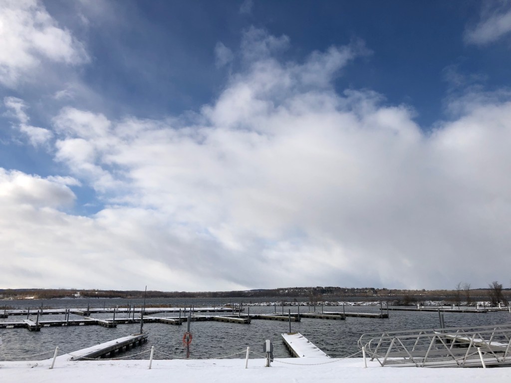 The still of the Onondaga Lake Marina is a good spot to stop and think during a December stroll.
