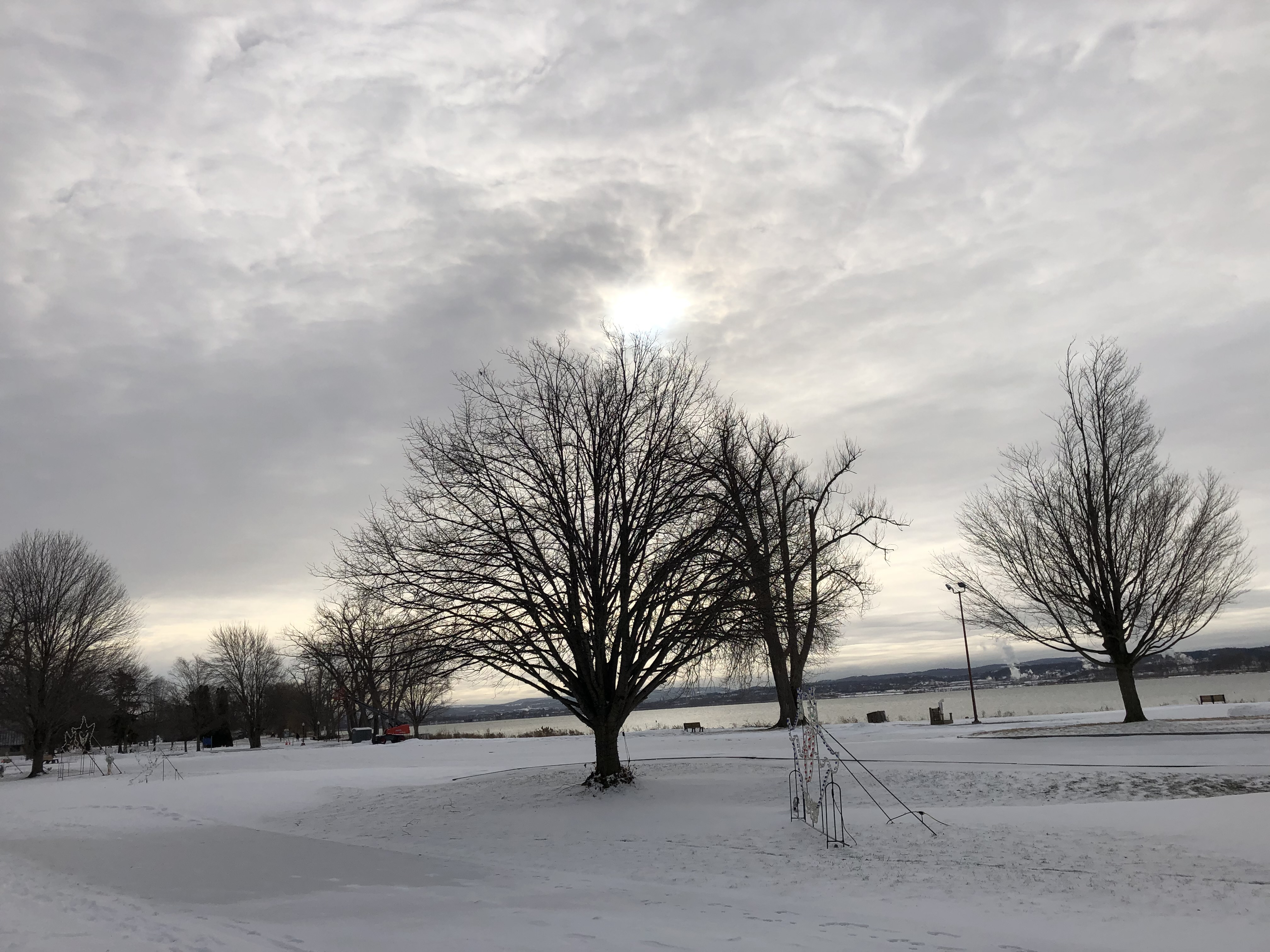 My beloved trees at Onondaga Lake Park show their deep winter mood as the sun hangs out half-hidden in a foreboding sky.