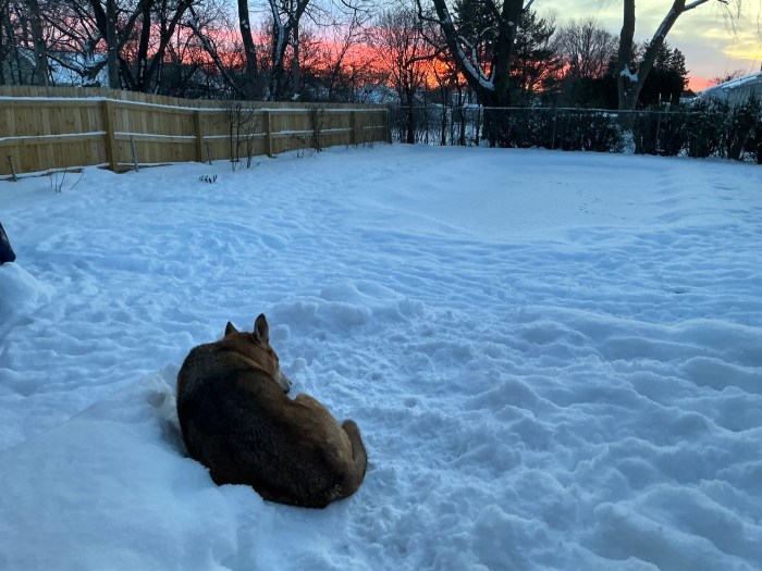 Our cherished rescue mutt doesn’t mind a bed of snow on the back deck one bit as she relaxes at the sun says hello to the east.