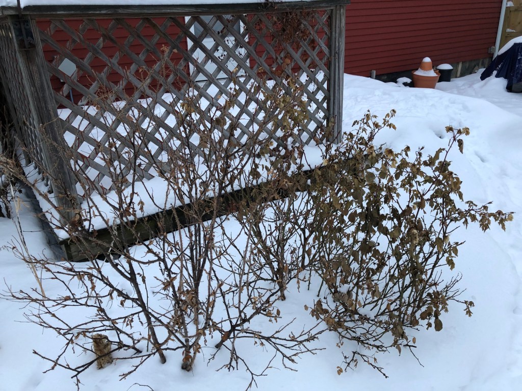 Steady snow cover and cold through January and February has left our roses in a deep slumber.