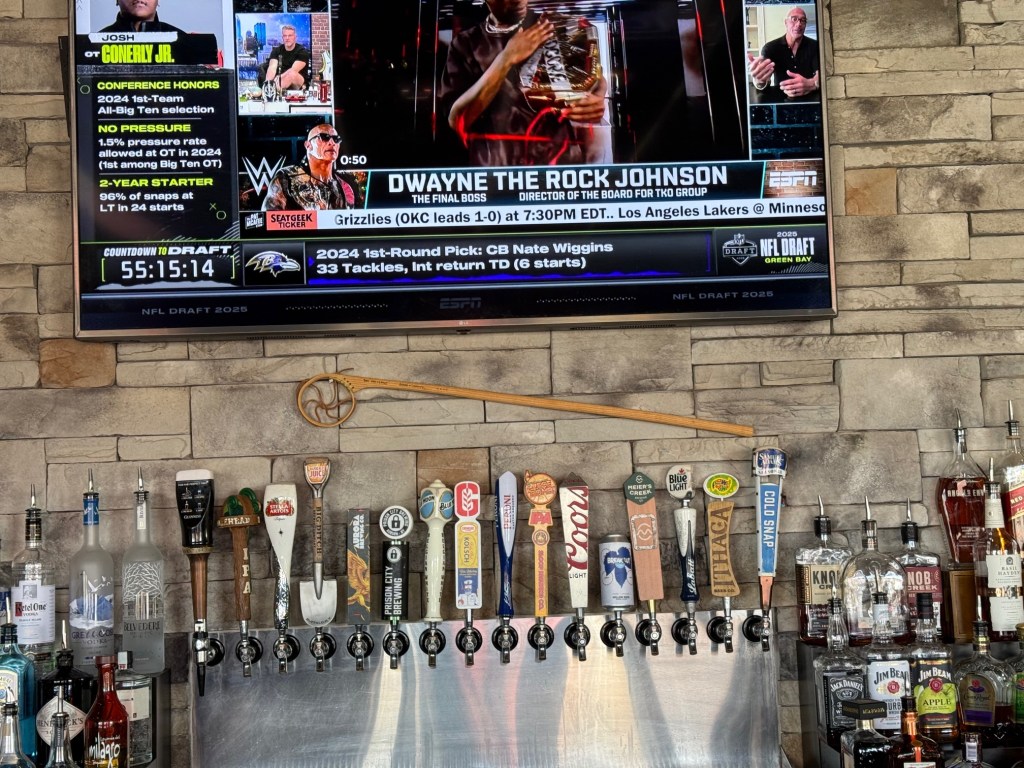 A real pice of history, a stick in the style used at the inception of the sport found at Cornell University, hangs at the center of the bar.