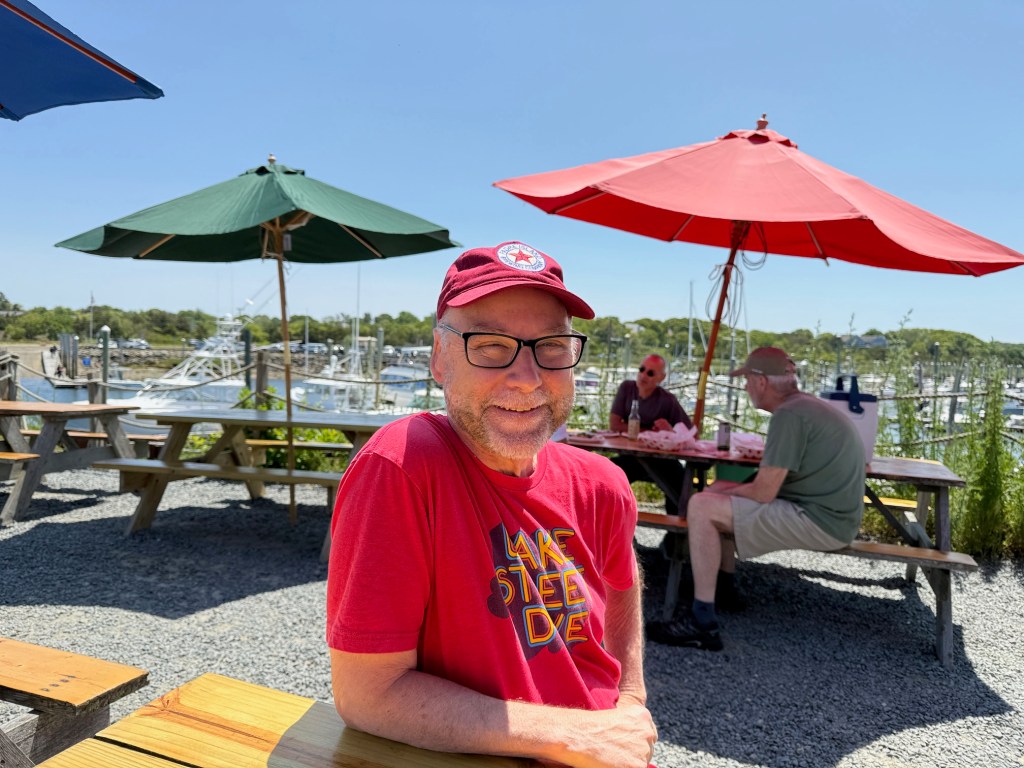 My dear wife Karen and I both ordered the steamed pound-and-a-halfers at the rustic marina.