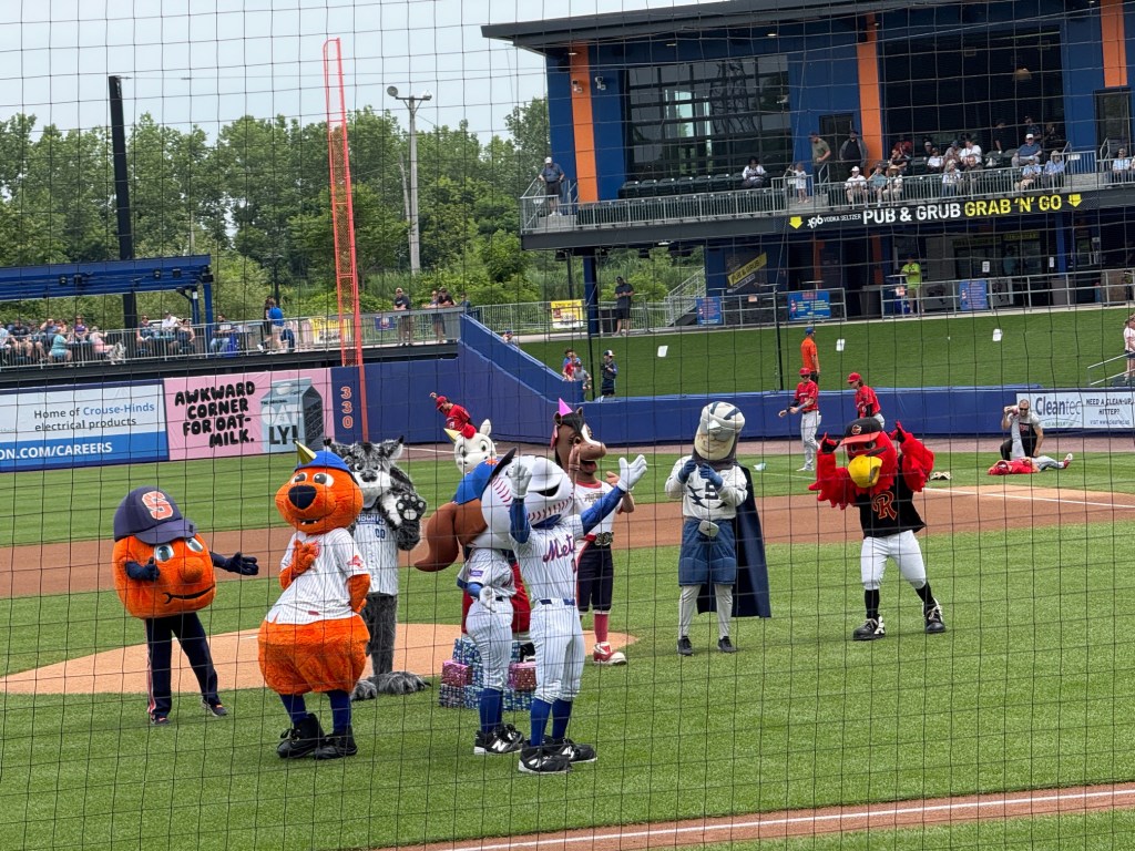 Otto the Orange, longtime mascot for the Syracuse University squads showed its appeal, as did Crunch Man, famous mascot of our AHL hockey squad the Syracuse Crunch. The red bird for International League rival Rochester Red Wings drove down the New York State Thruway. Other local college and pro squads also were represented.