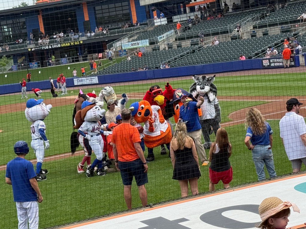 The gaggle of mascots welcomed fans inside the main exit, and Mr. Met and Mrs. Met made the trip up from the Big Apple, happy to pose with excited Metsies — including happy daughter Elisabeth.
