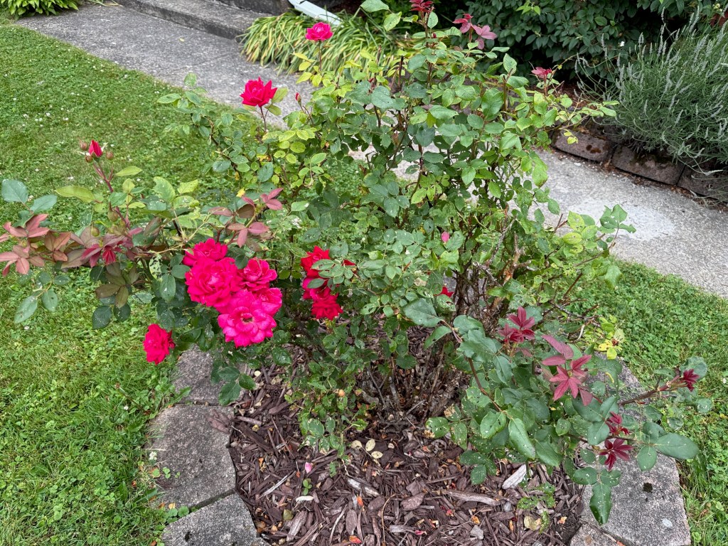 Our front corner knockout roses sometimes come in thick as thieves during a blooming cycle.
