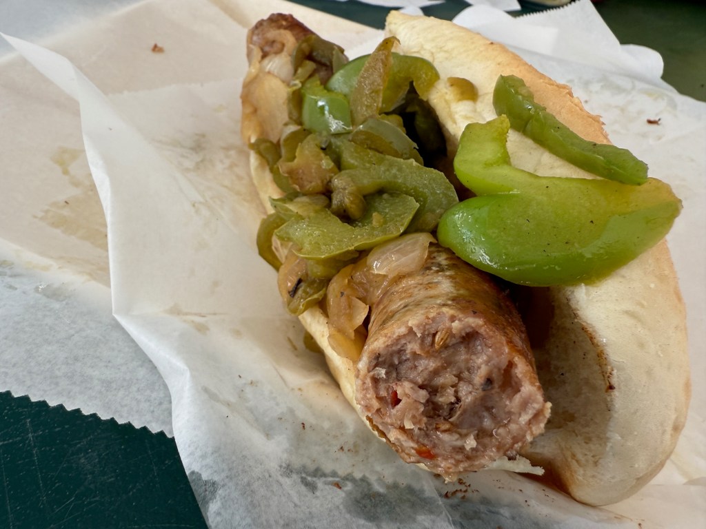 For our New York State Fair proper meal, my dear wife Karen and I decided upon the tried-and-true sausage sandwich, piled with peppers and onions.