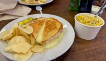 Combo meal. My dear wife Karen and I were fascinated by the cafe attached to Sauders on our first trip west this summer. So we timed visit two for lunch time. After a wait on line behind a half-dozen or so other hungry parties, I decided on the combo special of grilled cheese and chicken…