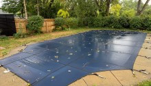 Leaves, out. The pool cover keeps stuff out from September to late May. I do like watching our cherished rescue mutt carefully walk around it as she does her backyard business.