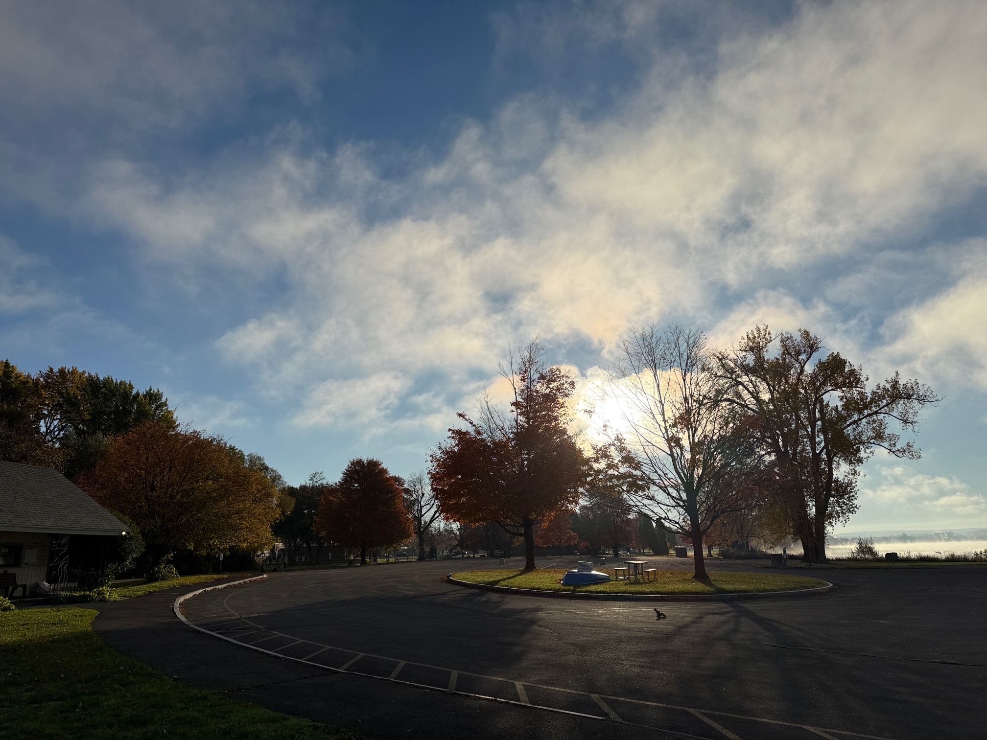 The clouds and trees tried their best to hide the early morning sun during my Onondaga Lake Park autumn stroll.