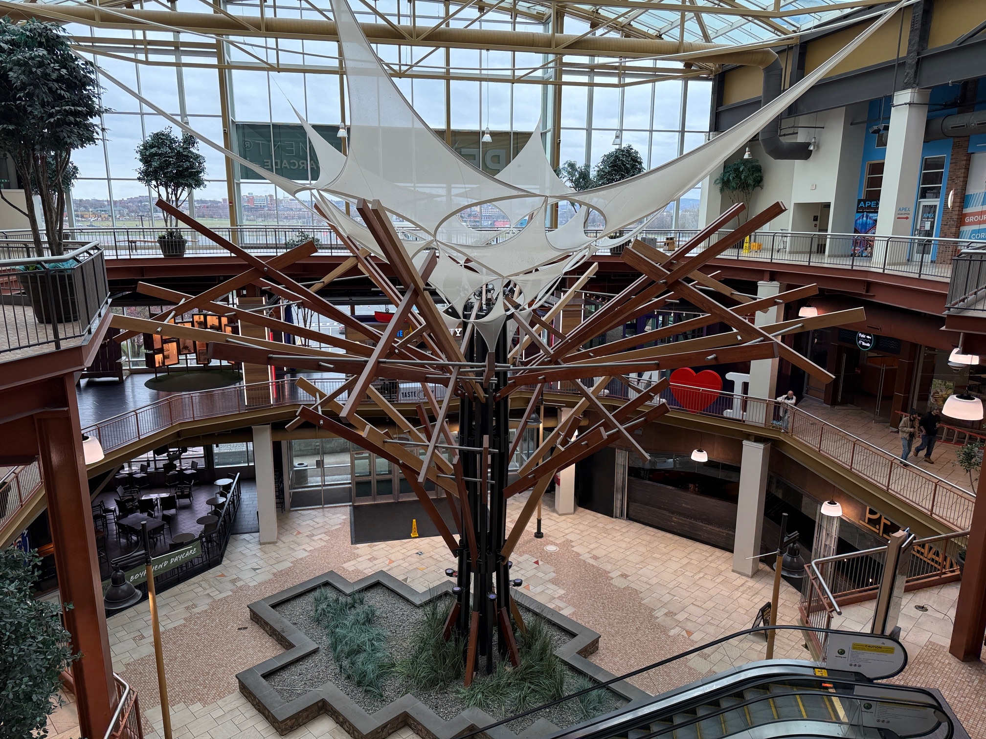 I peered down from the second level at the portion of our mega mall Destiny USA called The Canyon and appreciated the big art.