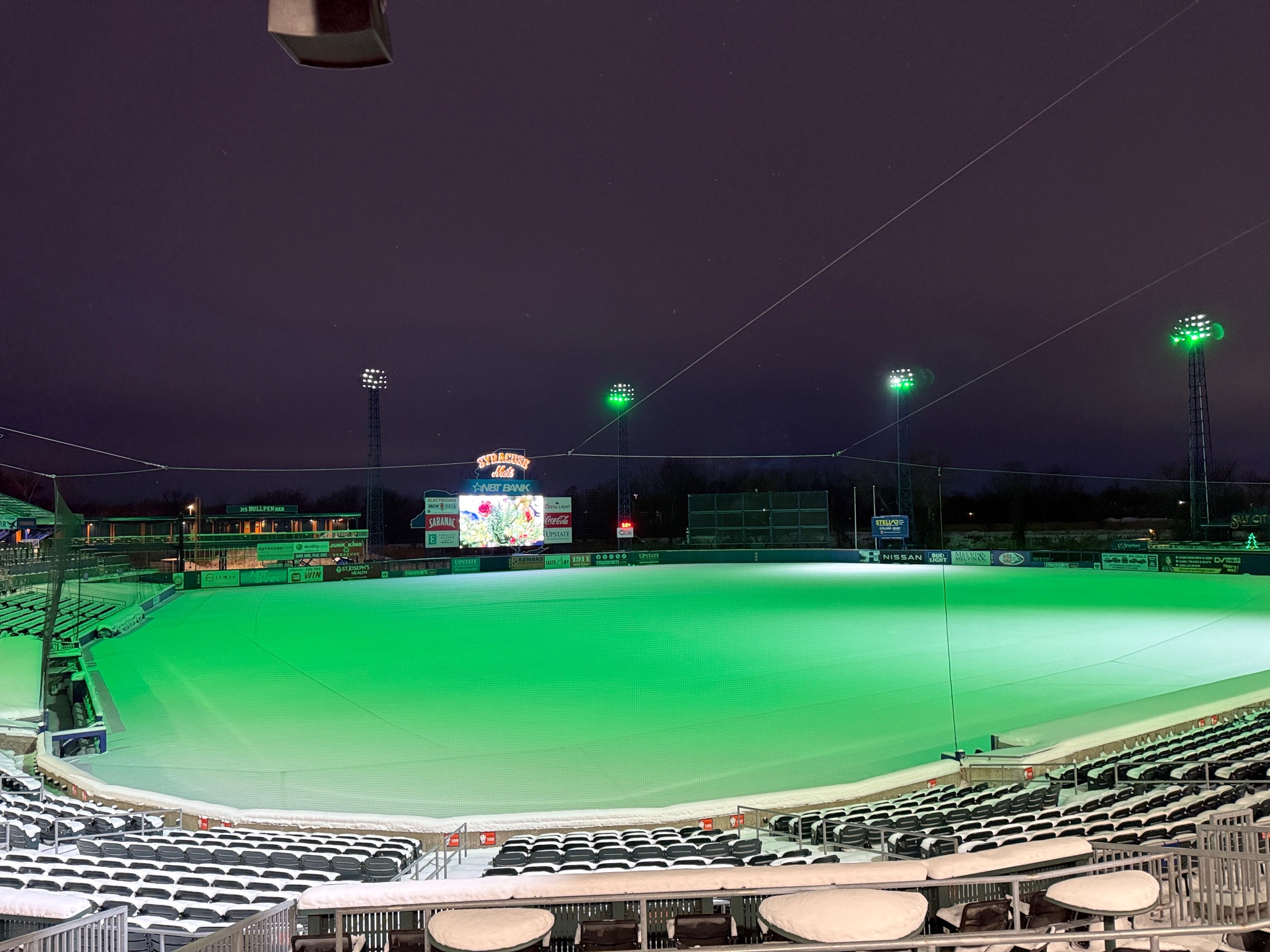 They bathed the tarp covering the field in a cool seasonal green lighting.