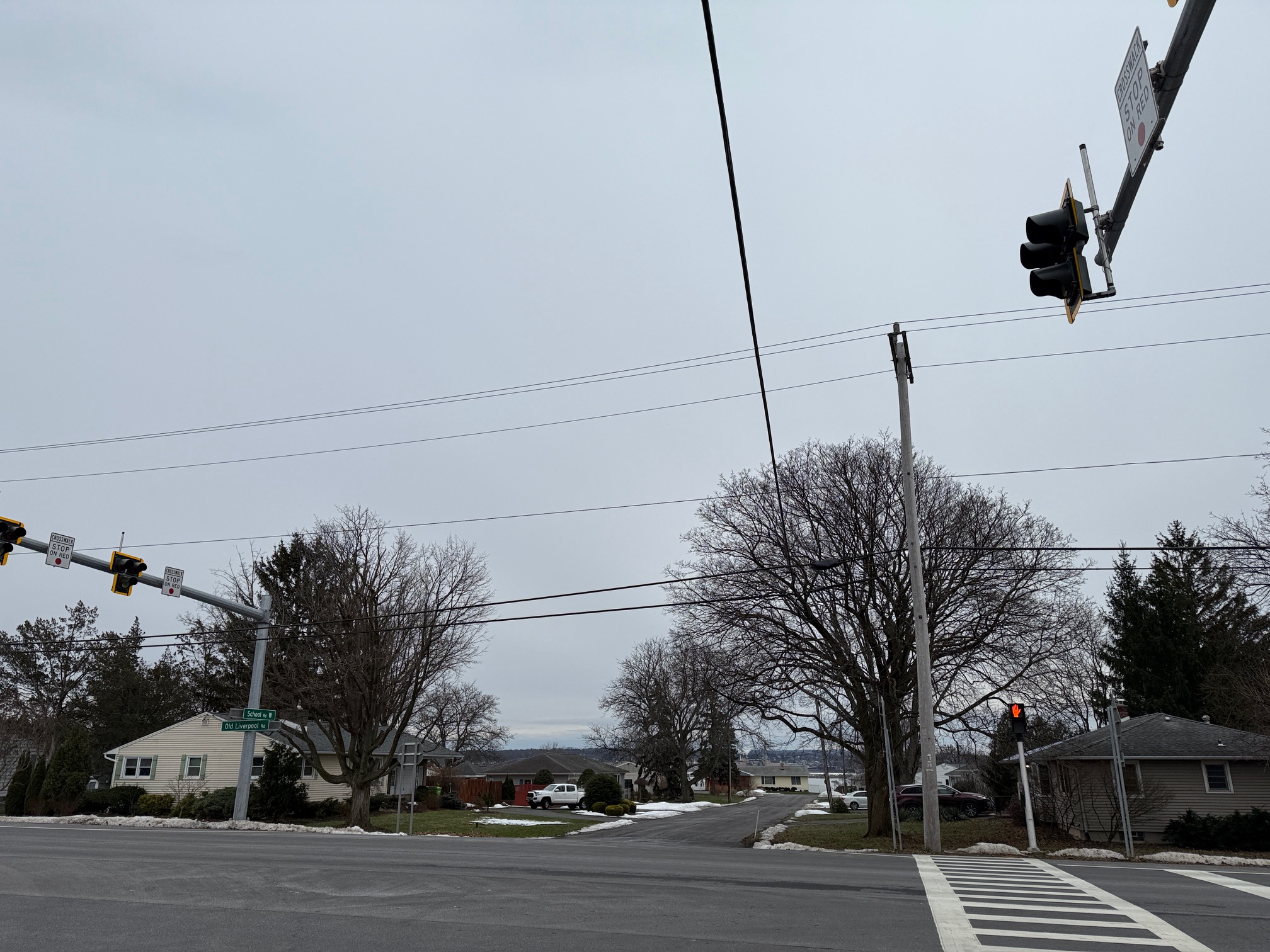 There are more houses and another, busier cross road between us.