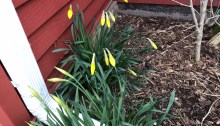 Bright spot arrival. The up-and-down temperature game this spring caused a bit of breath-holding between the sprout of green and the appearance of the yellow flowers of our front-ard daffodils.