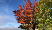 There’s some color. Taking a little stroll past the neighborhood triangle, I spy a tree-a-changing in this autumn of hanging-on-to-green.
