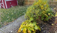 Mellow yellow. Yes, indeed, our back garden plants are finally changing their leave colors. Biggie. The yellow of the rose leaves is bright, and the size of the hostas leaves amazes me.