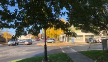 Spotted during a work break stroll Tuesday morning in the Village of Liverpool: Two trees outside the Retreat had leaves that were sporting color change. Already, I wonder?