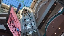 Interesting angles. Taking a morning stroll here and there through Syracuse’s mega shopping, dining and entertainment complex Destiny USA after scoring a few great birthday gifts for my dear wife Karen, I find a cool view from the bottom floor. Retired-guy-I doesn’t mind this visit to the collection of brick-and-mortar.