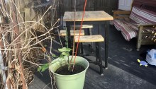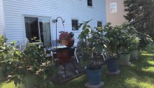 With a head start. My fig tree whisperer friend John texted with the message that it was time for our fig to move from its first winter shelter inside our second bedroom to the great outdoors of our backyard. Last year this baby started its life, planted carefully by John and lasting its first summer…