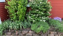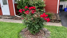 I’m happy when the big corner rose bush up front takes its turn making our yard look spiffy. It’s a tough year for roses, we were told by the local experts when we visited this spring’s fair at the Liverpool Public Library. Tomorrow, you get to see our backyard roses.