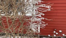 Coating. Here’s what happens when the furnace exhaust pipe sends out its steam into February zero temperatures and one of our front-yard bushes has branches ready to catch the water particles for the quick freeze. Pretty, yes.