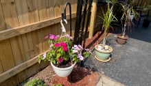 Take a stand. My dear wife Karen continues to find great accessories for our flowers. The hanging basket she received from Elisabeth and George months back still flourishes on the stand.