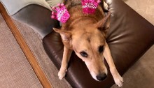 Our cherished rescue mutt Ellie B aka Dogamous Pyle seems to be as amazed as I am that we’ve been up for, oh, an hour, and the side alcove light is shining on her because the sun is only now just threatening to rise.