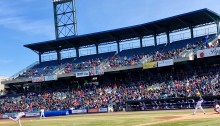 Our family excursion to see the first-ever Syracuse Mets game brought a traffic jam. By the time we wound through the streets and into the satellite lot, it was perilously close to the Thursday afternoon start time of 2 o’clock. Yet still there were deep lines for the gate security check. We still made it…